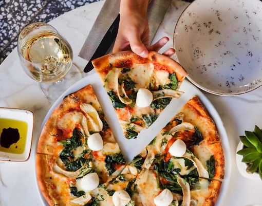 Un restaurante italiano cerca de la galería que sirve pasta, pizza y platos mediterráneos.