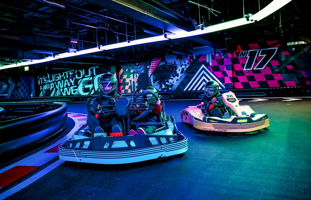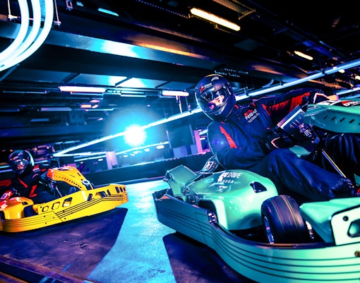 Drive high-performance electric karts on a technically designed indoor circuit inspired by Formula 1 racing principles, featuring tight corners, straights, and competitive racing lines.