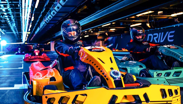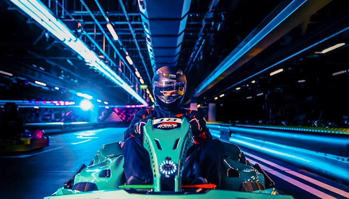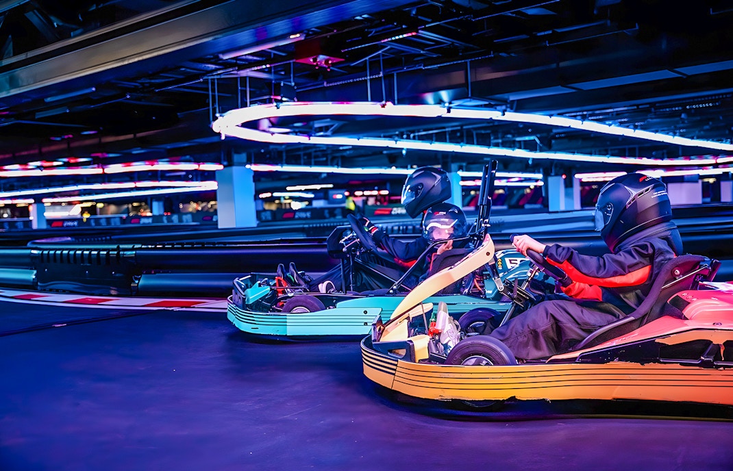 Drive high-performance electric karts on a technically designed indoor circuit inspired by Formula 1 racing principles, featuring tight corners, straights, and competitive racing lines.