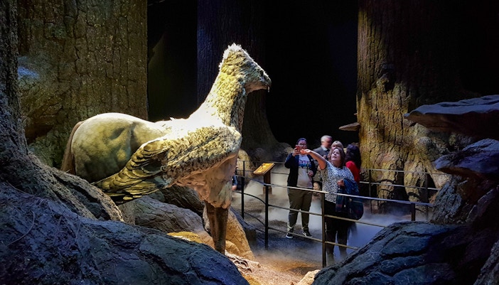 Un animatronic a grandezza naturale di Fierobecco si inchina con grazia dalla sua radura nella foresta. Ricoperto di piume posizionate singolarmente, presenta sottili movimenti della testa, spostamenti delle ali e occhi lampeggianti che riflettono la sua nobile personalità nei film.