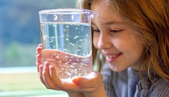 Child observing cockroaches in SEA Life London Rainforest section.
