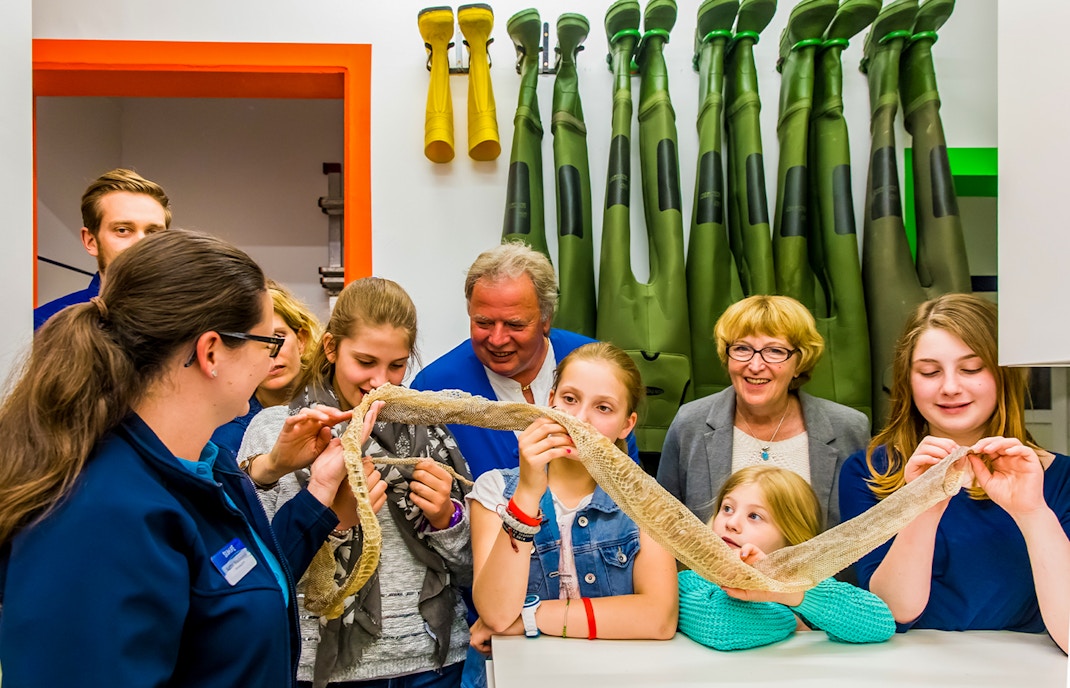 Kids observing a guide holding a sea creature on SEA LIFE London Behind the Scenes Tour.