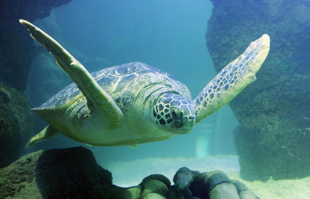 Sea turtle swimming in an aquarium at Sea Life London.