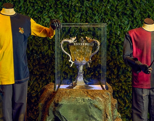 Walk between the long tables assigned to Gryffindor, Hufflepuff, Ravenclaw, and Slytherin. Each section features original props and costumes used by the actors representing their respective houses.